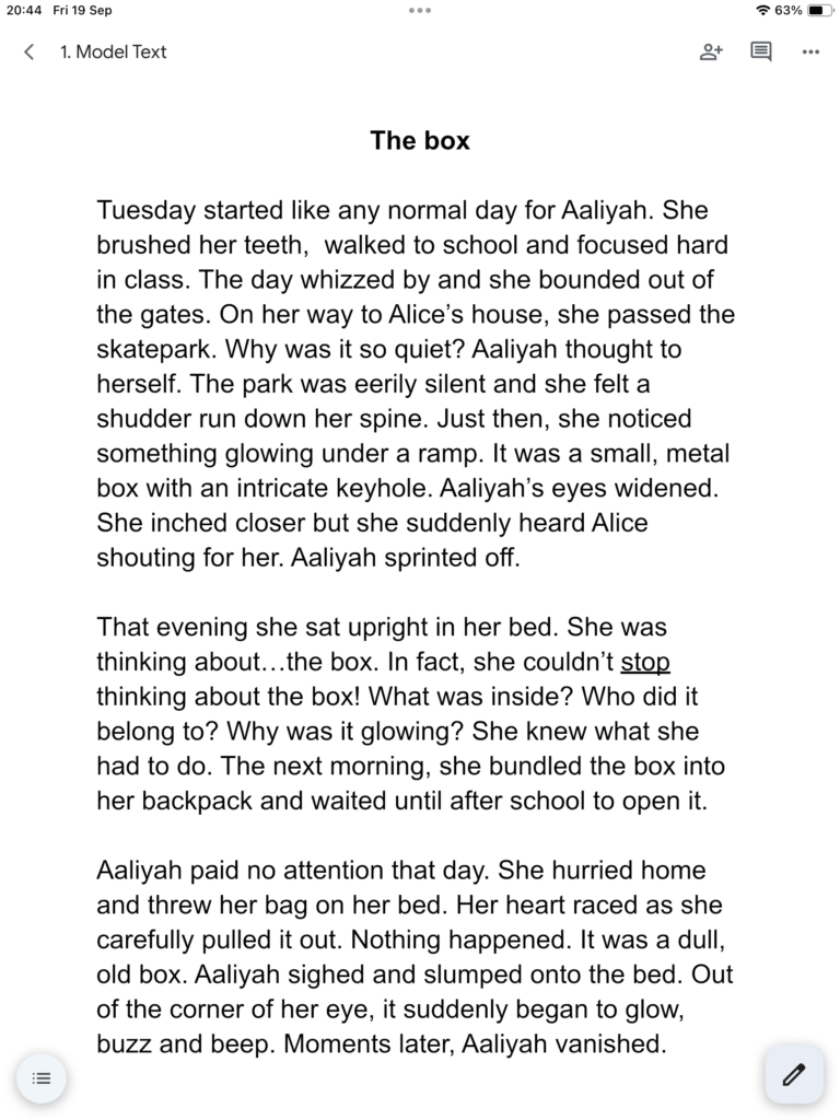 We started our new writing unit this week learning a short story called ‘The Box’. It centres around a character called Aaliyah who discovers a mysterious, glowing box. As her curiosity takes over, she returns to find the box and take it home with dire consequences…